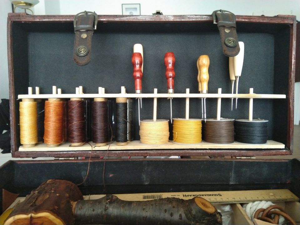- Sattlergarn - hiervon zwei verschiedene Sorten, oben ein günstiges Polyestergarn, unten ein deutlich teureres Leinengarn für die Herstellung von Lederwaren in A-Lager-Qualität.