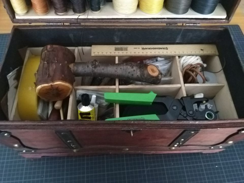 Nur ein Geheimnis bleibt noch zu lüften: woher habe ich meine Werkzeugtruhe mit ihrem Fächern und dem Garnmagazin?