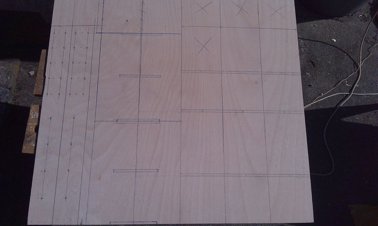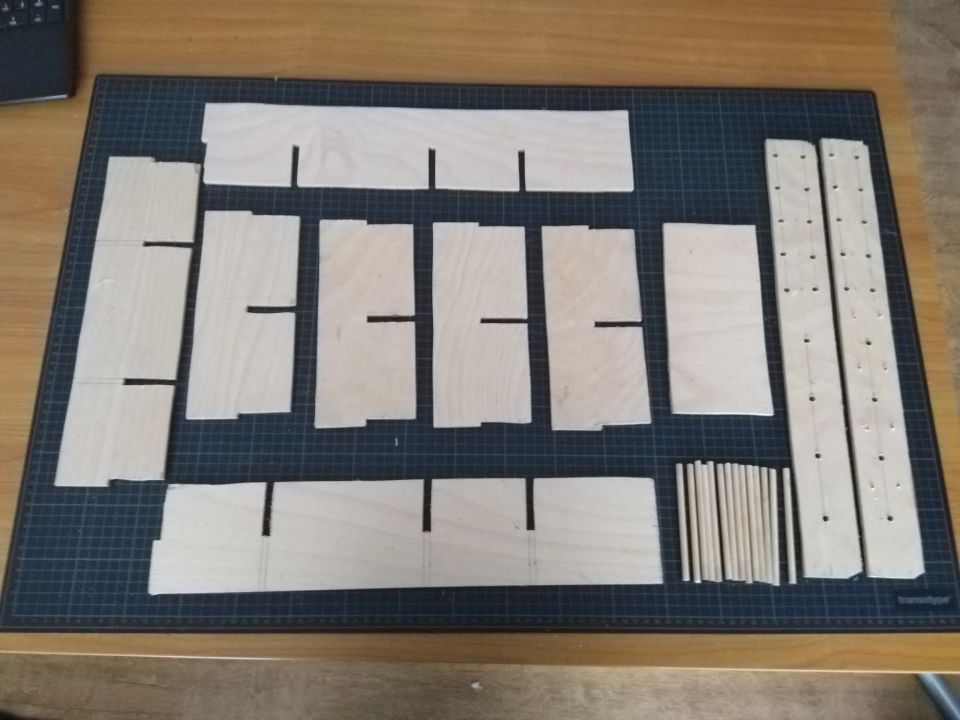 Also habe ich mir eine Sperrholzplatte und einen 8mm Rundstab besorgt und zunächst die benötigten Teile aufgezeichnet, sie dann ausgesägt und die Bohrungen gesetzt.