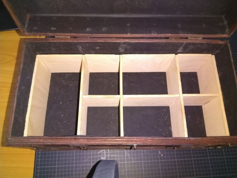 Die Antwort ist: sie ist ein Eigenbau. Die Basisschatztruhe im Mittelalterlook gab es ebenfalls bei Ebay für knapp 30 Euro, aber natürlich ohne Fächer und Garnhalter. Glücklicher Weise bin ich halbwegs geschickt was Holzarbeiten angeht, nicht ganz so ein Holzwurm wie unser Baumeister Marcus, aber brauchbar.