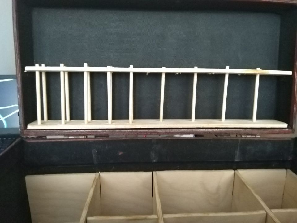 Wie ihr sehen könnt sind die Kanten der Einzelteile nicht glatt, sondern jeweils auf der Hälfte eingekerbt. Die Rundsabteile sind so zugesägt, dass sie aus der oberen Halterung noch einen guten Zentimeter herausragen (Damit man die Garnrollen später auch wechseln kann).