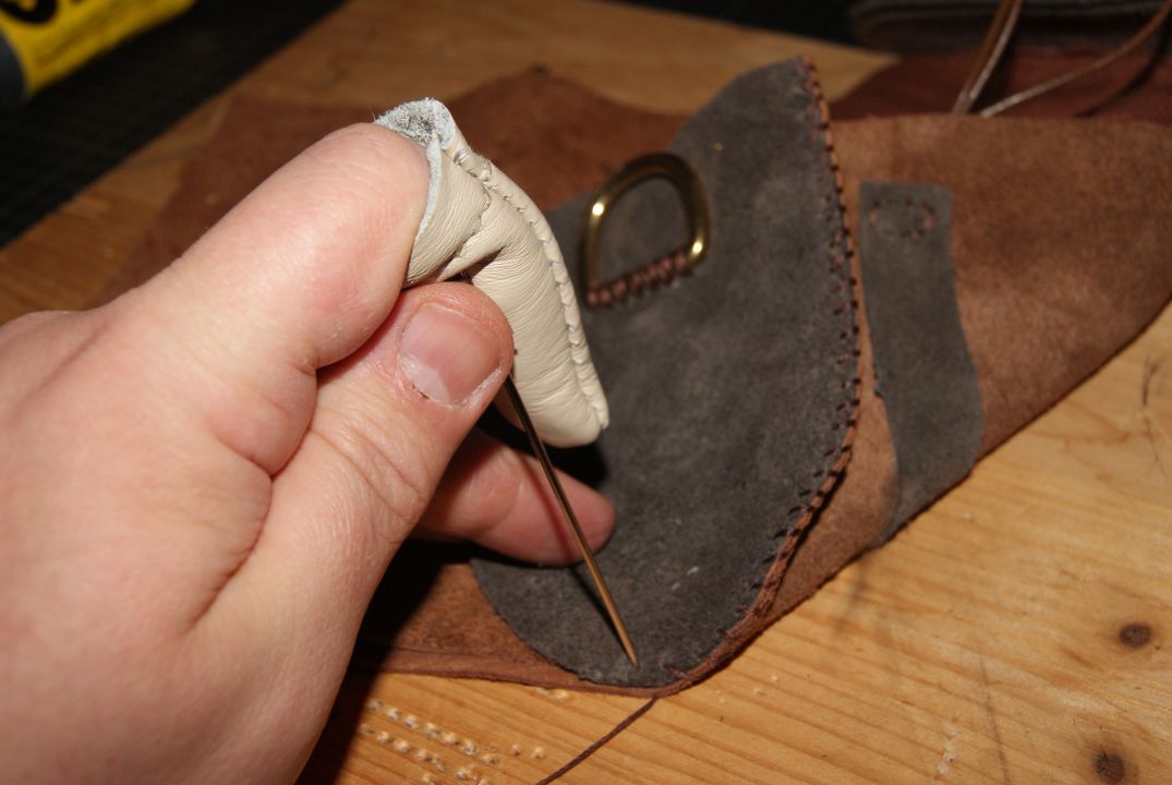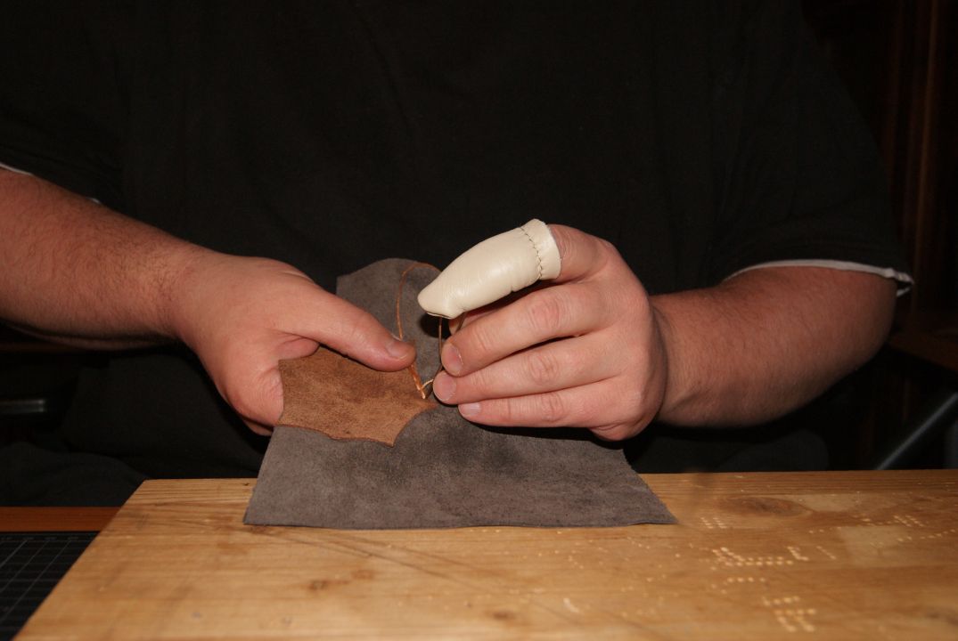 Zum Vernähen nutze ich hierbei einen Überwendling. Anders als der Sattlerstich erhält der Überwendling eine gewisse Flexibilität und verzeiht dadurch kleine Fehler in der Dehnung der Lederstücke.