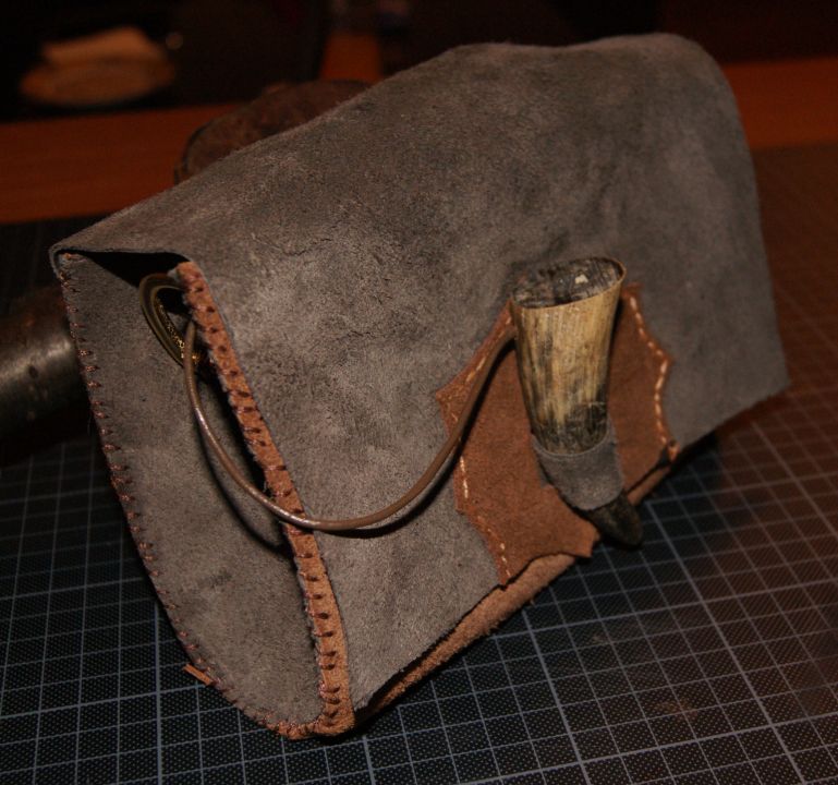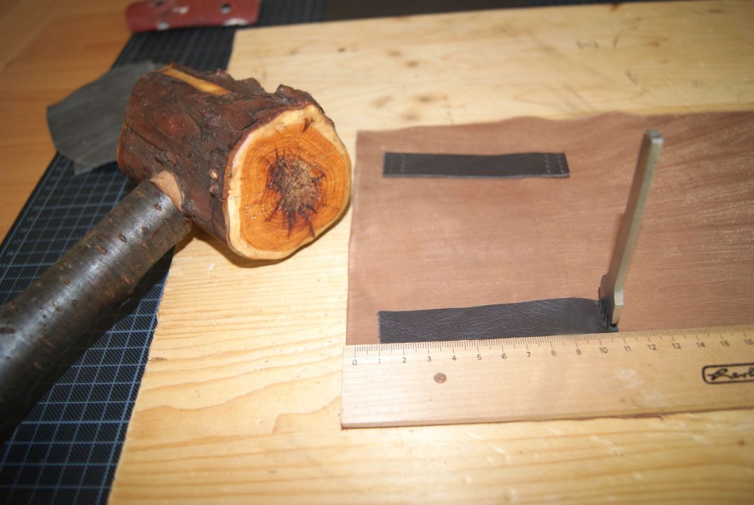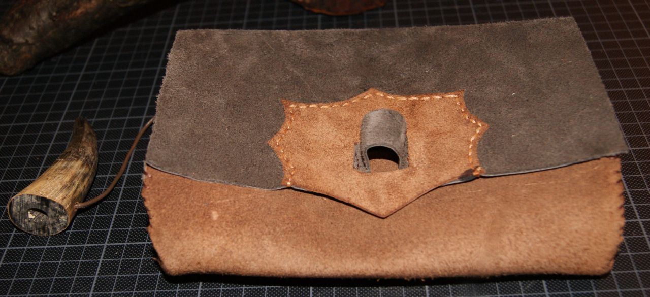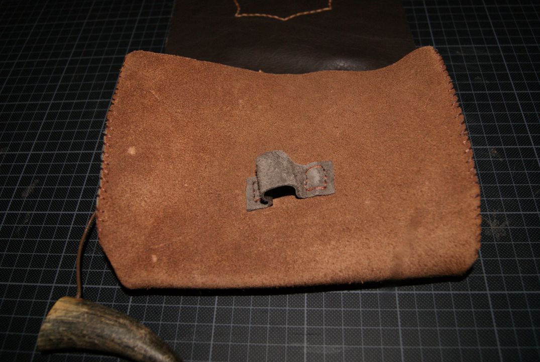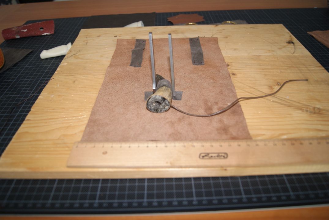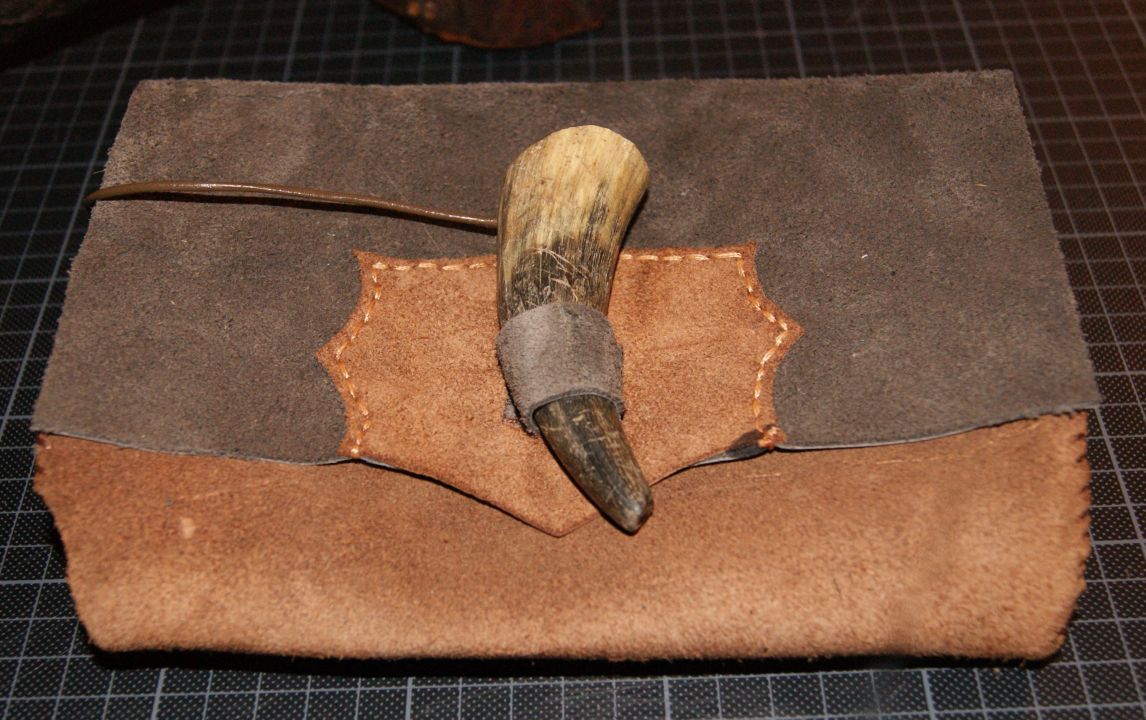 Als allerletzter Arbeitsschritt bleibt jetzt nur noch an beliebiger Position im Korpus ein Loch zu stanzen durch das man die Lederschnur von der Hornspitze durchzieht und auf der Tascheninnenseite verknotet.