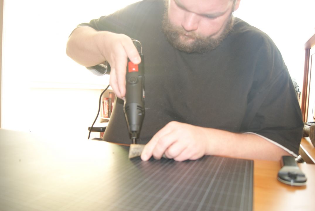 Da man bei meiner Tasche die Wildlederseite sehen soll, muss ich die glatten Seiten der beiden Korpusteile und der vier Seitenteile anschleifen. Dies erledige ich mit einem Schleifpapier mit 60er Körnung. Es geht dabei darum den Untergrund für die spätere Verklebung aufnahmefähig zu machen.