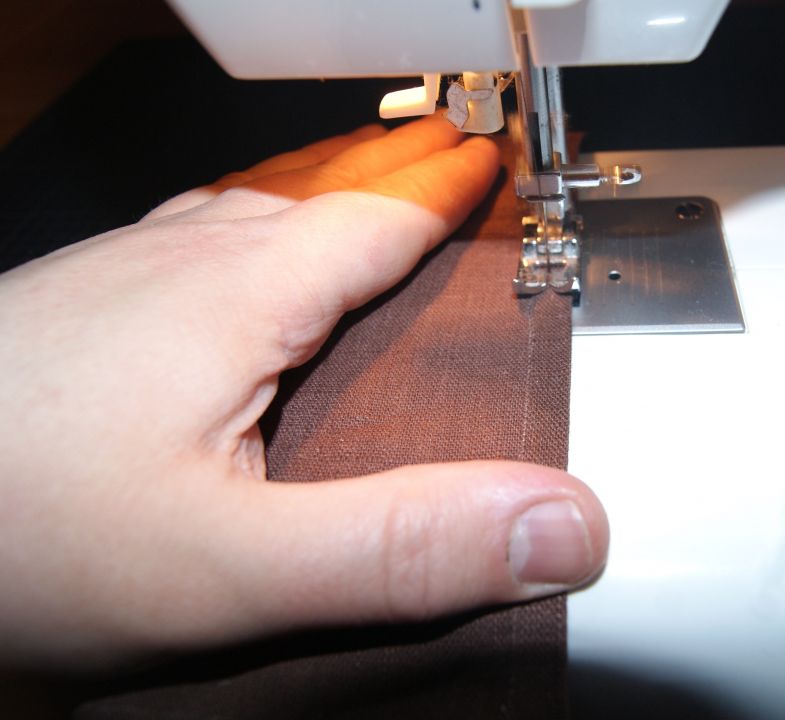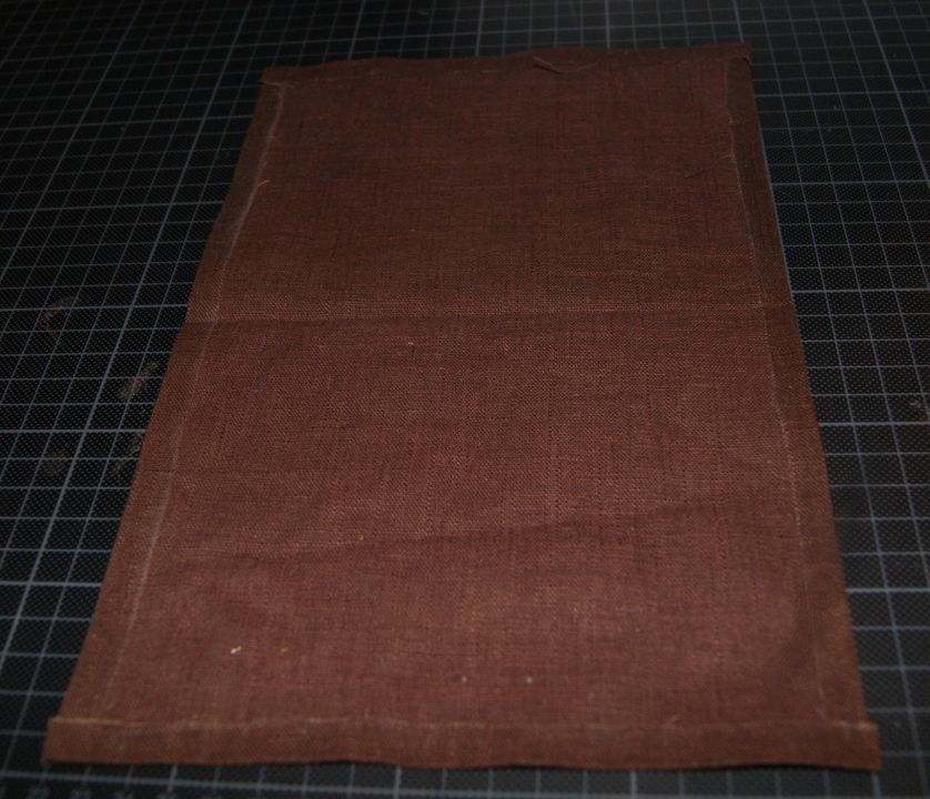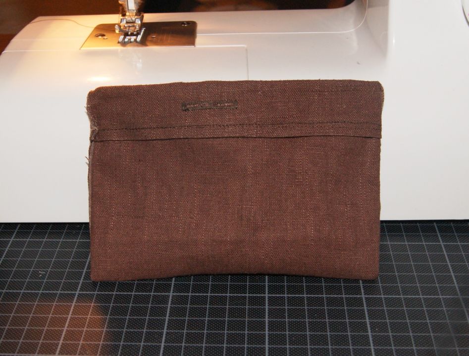 Ich verwende hier einen braunen Leinenstoff, ein Reststück das vom Nähen meines Halbkreismantels noch übrig blieb. Wir schneiden ein Rechteck mit einer Größe von 21 x 35cm zu, falten die fransigen Ränder nach Innen und vernähen sie. Anschließend wird das Stück einmal gefaltet, sodass ein Rechteck mit ca. (je nachdem wie ihr eure Nahtzugabe bemessen habt) 20 x 17cm entsteht. Wichtig sind dabei nur die 20cm Breite, weil das auch später unsere Taschenbreite wird. Wir setzen links und rechts Nähte und erkennen zum ersten mal eine Taschenform. Nun nähen wir etwa mittig mit einem Abstand von 3cm vom offenen Taschenrand ein Knopfloch ein, legen den oberen Rand auf einer Breite von 2cm nach außen um und nähen einmal knapp am Rand entlang. Es entsteht ein Tunnel, in den wir später ein Lederband einziehen und so die tatsächliche Breite der Innentasche einstellen können. Nun müssen wir sie nur noch auf rechts drehen, das Band einziehen und schon ist die Innentasche fertig.