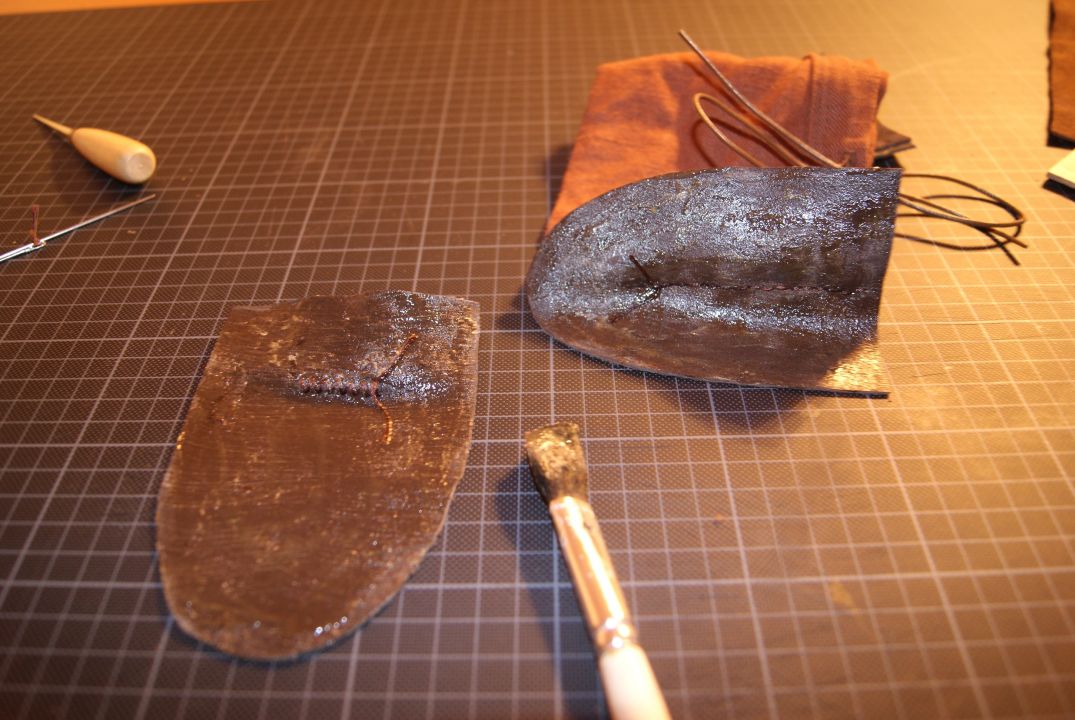 Redaktionelle Anmerkung: An Stelle des Schusterleimes würde ich für ein A-Lager-Produkt Knochenleim verwenden. Diesen gibt es auch heute noch zu kaufen, da er sich im Kunsthandwerk wieder großer Beliebtheit erfreut. Man bekommt ihn in Tablettenform oder am Stück. Für die Verarbeitung muss er aber erst 1:1 mit Wasser versetzt werden. Dann lässt man ihn quellen und muss die geleeartige Masse anschließend auf min. 55°C (sonst klebt sie nur schwach), max. aber 64°C (sonst klebt sie gar nicht mehr!) erwärmen. Für diese Tasche ist mir das zu aufwändig.