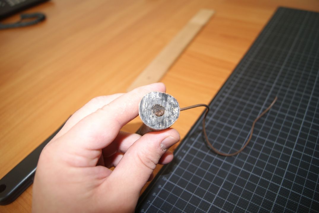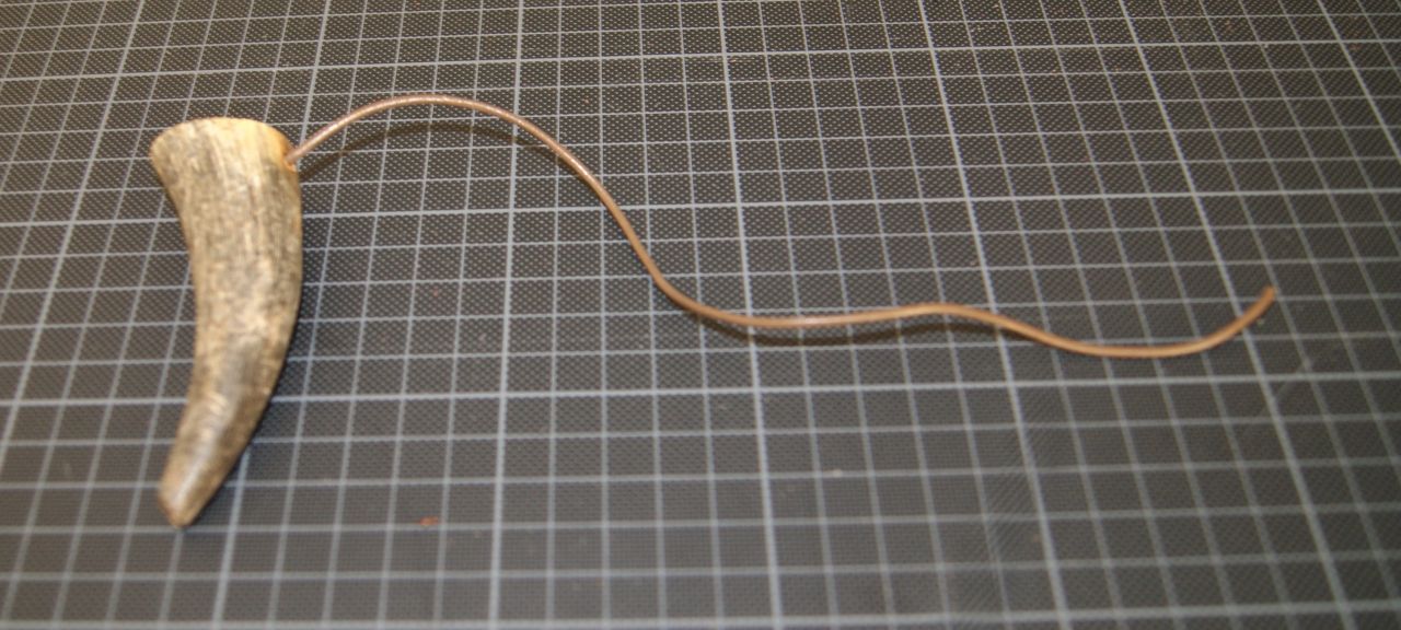 Als Taschenverschluss habe ich eine Hornspitze ausgesucht, die mit einem Lederband an der Tasche gegen Verlieren gesichert werden soll. Dazu müssen in die Hornspitze zwei Bohrungen. Die Erste, mit einem Durchmesser von 8mm, schafft Platz für das Schnurende innerhalb der Hornspitze. Eine Bohrtiefe von 1cm reicht hier völlig aus. Die zweite Bohrung stellt den Kanal dar, durch den die Lederschnur von der Hornspitze zur Tasche führt. Diese Bohrung führt von der Seite der Hornspitze in das große Loch und sollte vom Durchmesser her etwas größer ausfallen, als die Schnur die wir verwenden wollen. In meinem Fall nehme ich eine 2 mm Schnur und eine 3mm Bohrung.