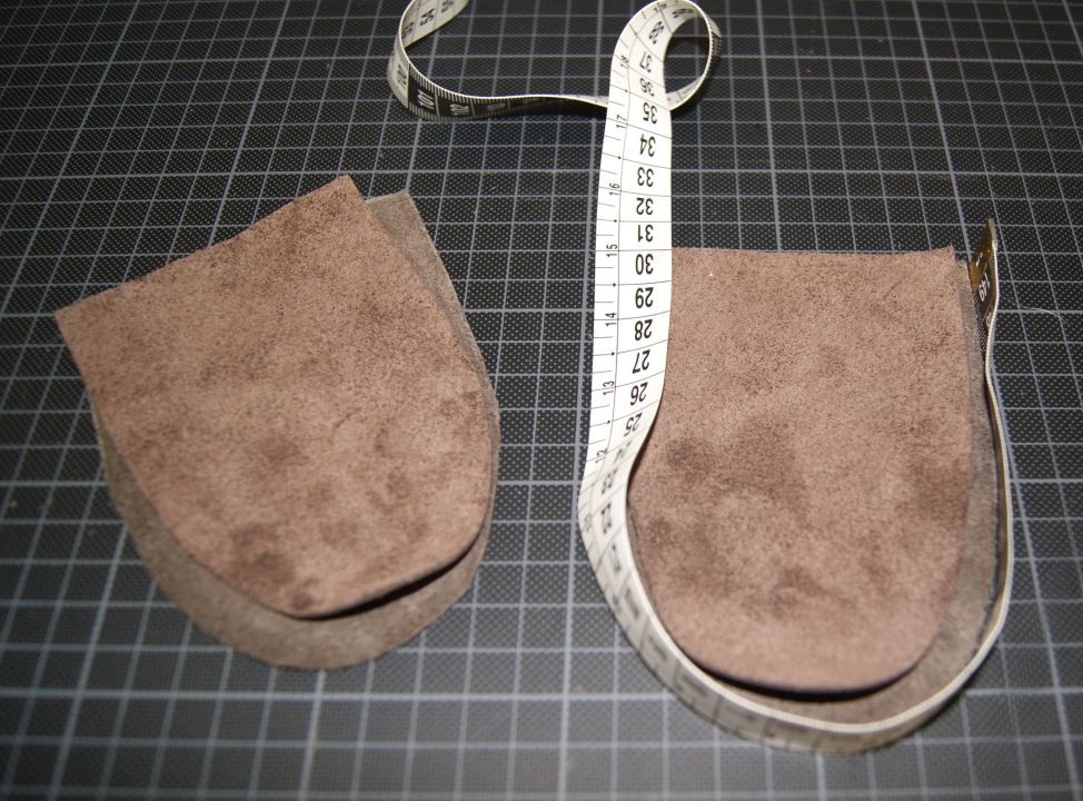 Wenn ihr alles richtig gemacht habt geht der Schnitt genau auf, dass heißt die Länge der Korpusbaugruppe reicht genau um die Rundung der Seitenteile zu bedecken (siehe oben: Länge der Rundung des Seitenteils = Länge des Korpusteils = 30cm). Wenn nicht, habt ihr entweder ein Teil falsch zugeschnitten oder irgendwo ein Lederteil beim Nähen zu sehr gestaucht oder gedehnt und müsst die entsprechende Naht leider wieder auftrennen.
